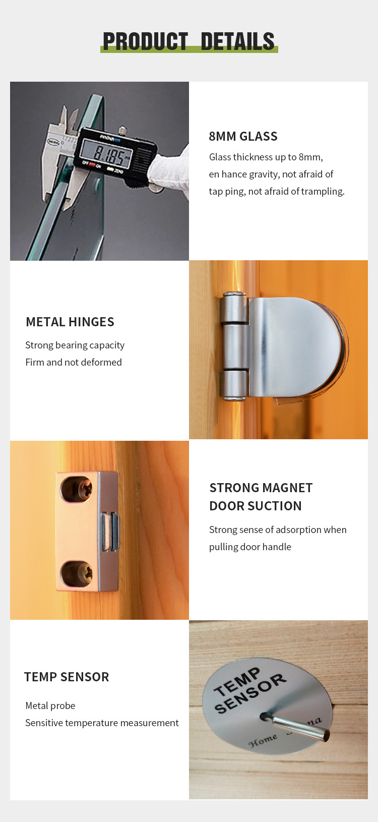 Robuste metallhengsler: Metallhengslene på infrarød- og dampbadstuerommet for 1-3 personer har en sterk bæreevne, noe som sikrer at de er faste og ikke-deformerte. De gir pålitelig støtte til badstuerommets struktur, og garanterer langsiktig stabilitet.