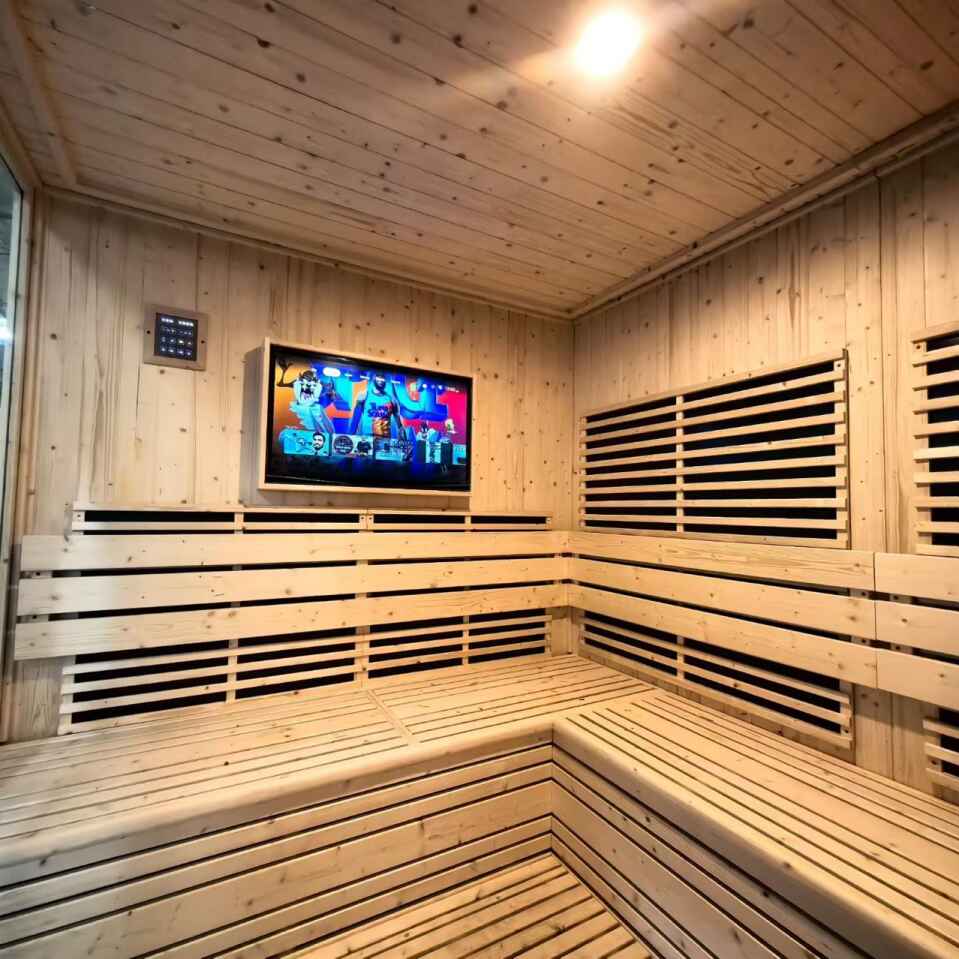 Den innebygde LCD-TVen (synlig på bildet) forvandler badstueopplevelsen: