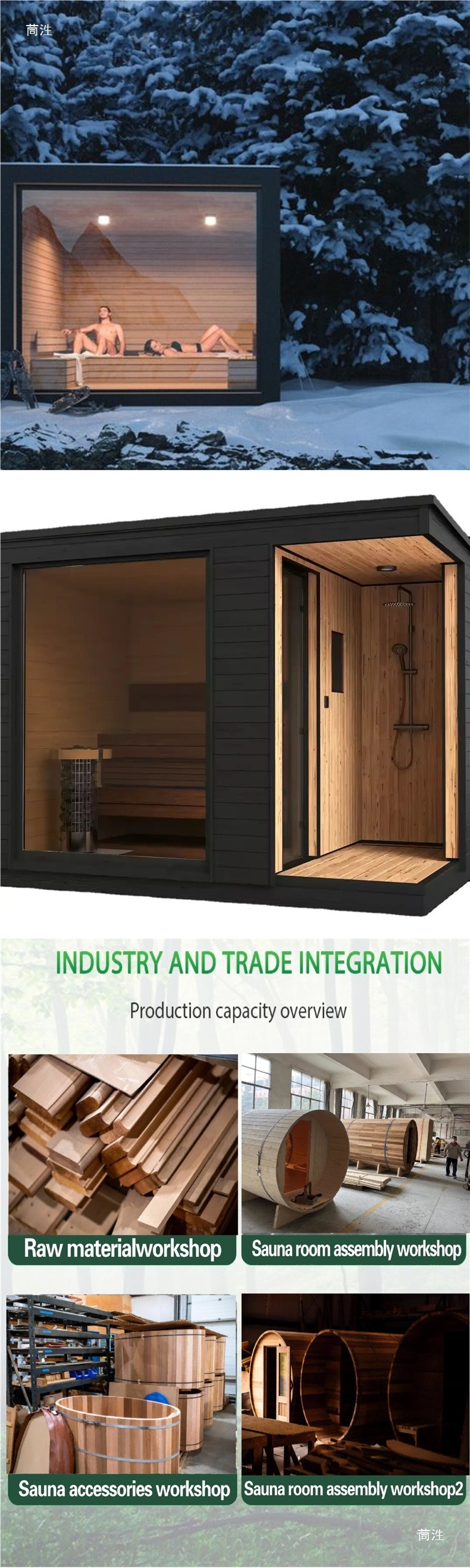 - Råmaterialekontroll: Utvalgte importerte anti-korrosjonsstokker og matgodkjente badstukomfyrmaterialer sikrer miljøvennlighet, varmebestandighet og holdbarhet fra kilden, i samsvar med nasjonale miljø- og sikkerhetsstandarder.