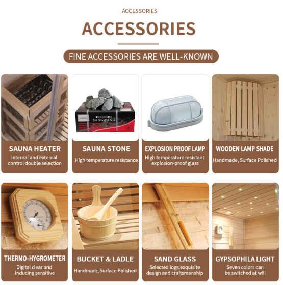 DeUtendørs glassdør utendørs dampbader utstyrt med 8 kategorier av kjernetilbehør, som dekker badstuens behov for hele prosessen, og viser kvalitet i detaljer: