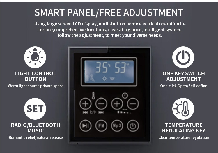 DeUtendørs glassdør utendørs dampbader utstyrt med et utendørsspesifikt, intelligent LCD-kontrollpanel i stor størrelse (vanntett og støvtett design), som realiserer "én-tasts kontroll" praktisk betjening: