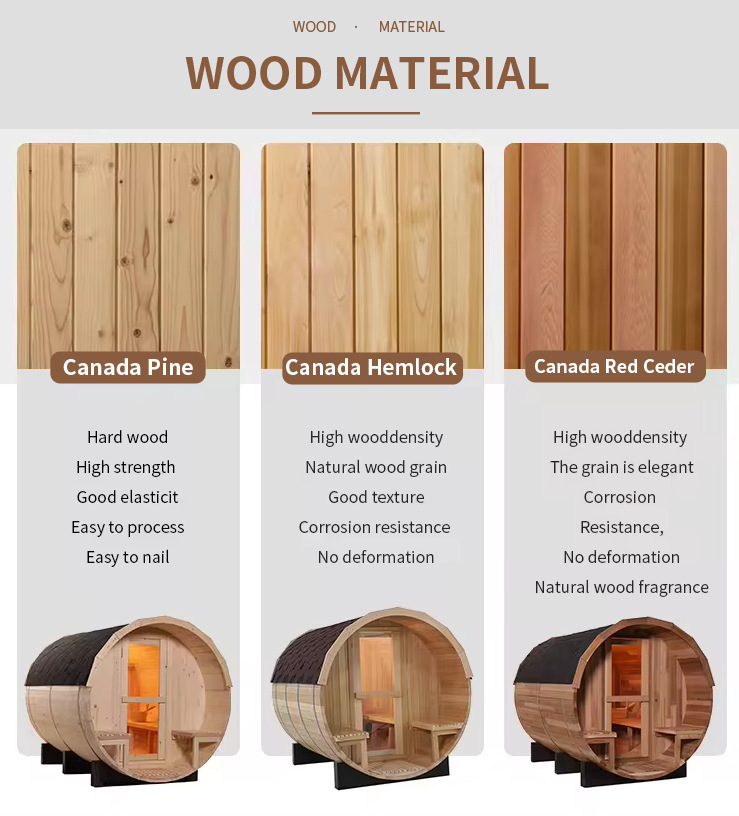Tretilpasning: Velger høykvalitets kanadisk importert utendørsspesifikt trevirke - furu (høy hardhet, kostnadseffektiv, anti-korrosjonsbehandlet), hemlock (høy tetthet, fuktbestandig og deformasjonsbestandig), og vestlig rød sedertre (naturlig anti-korrosiv, med naturlig treduft, sterk utendørs miljøbestandighet for kravene til holdbarhet),Utendørs glassdør utendørs dampbad.