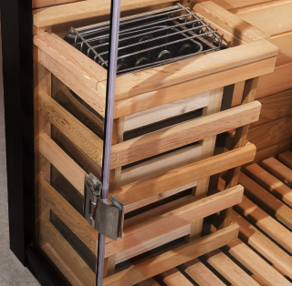- Badstuevarmer for jevn damp: Den medfølgende badstueovnen leverer jevn, skånsom damp – ideell for solobruk, siden den varmes opp raskt (ingen lang ventetid) og opprettholder en stabil temperatur (overvåkes via det innebygde termometeret).